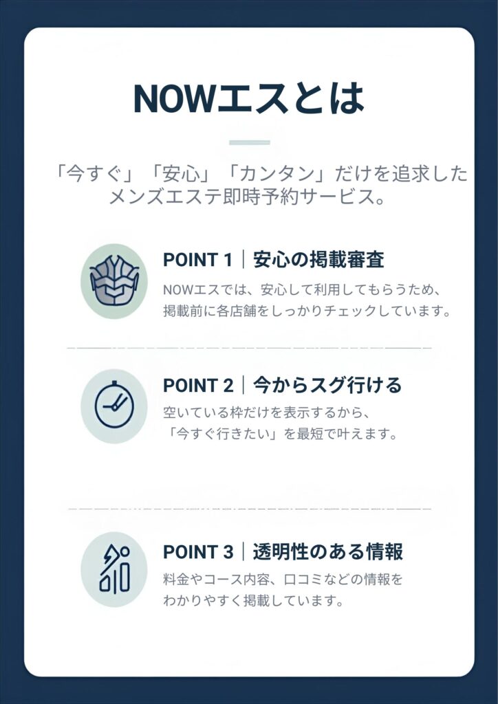 「すぐ行ける」「安心」「見やすい」に特化した、メンズエステの即時予約・検索サービスです。